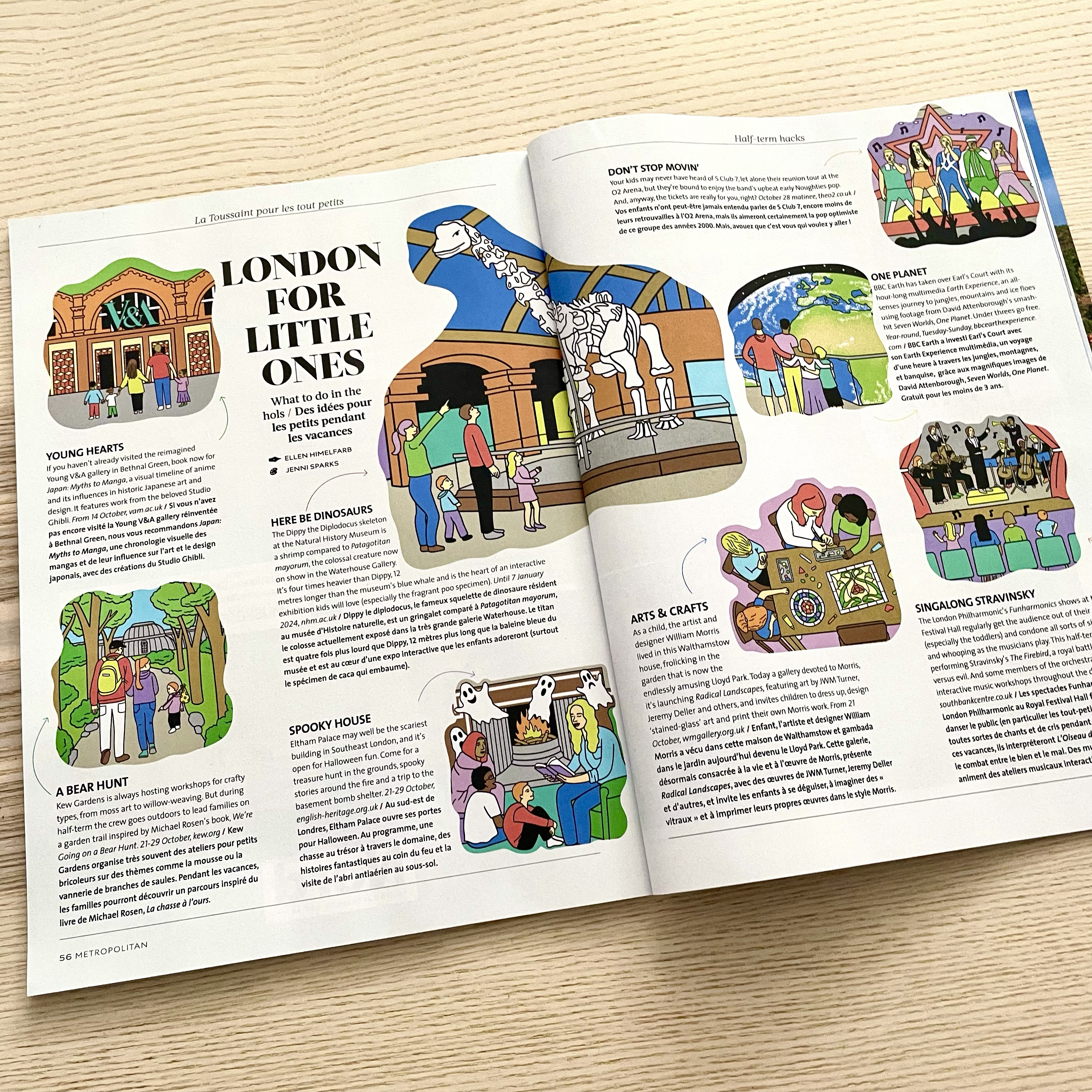 I was asked by Metropolitan Magazine (the magazine on the Eurostar) to illustrate eight different half term activities for families to do in London for an editorial piece in the magazine.