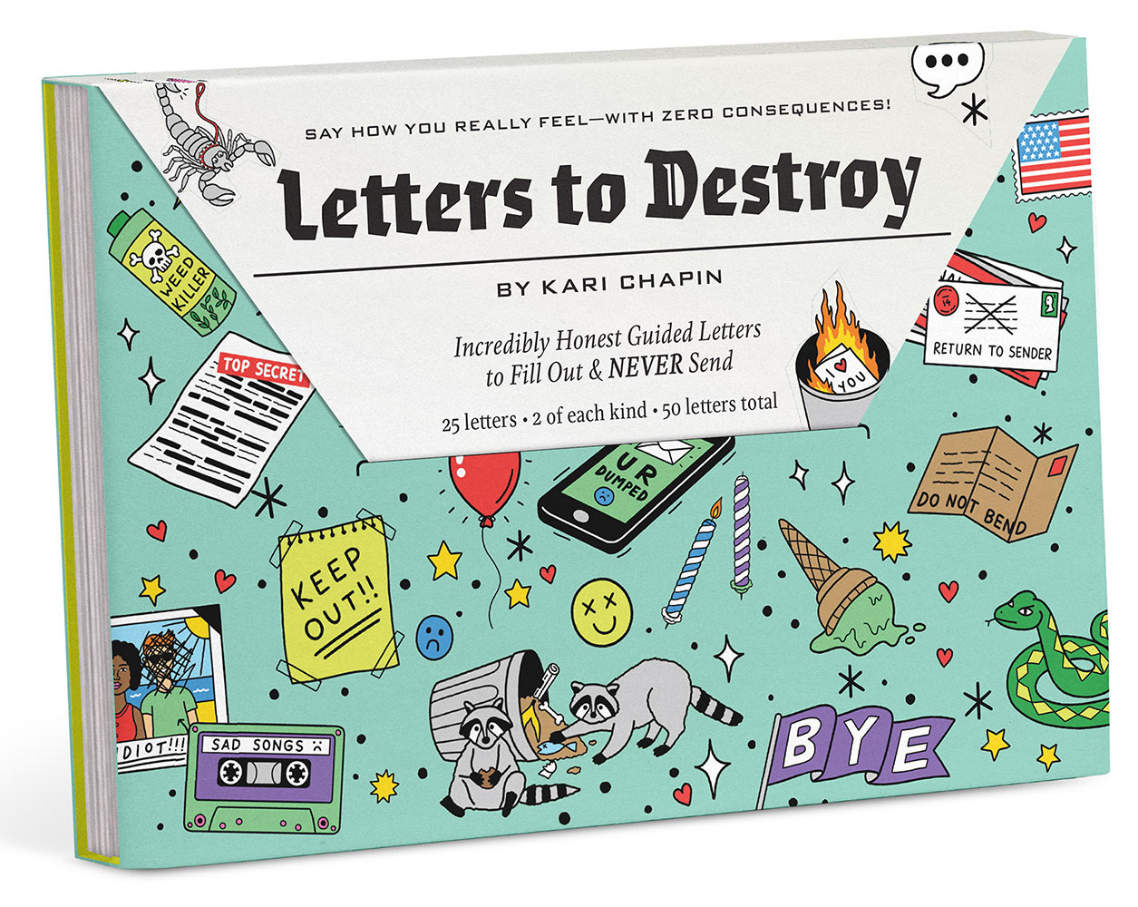 I was asked by Knock Knock to illustrate a book written by Kari Chaplin called ‘Letters To Destroy’. The book is a series of pre-written letters on different themes with blank spaces to personalise them. Ultimately these letters are meant to be destroyed in whatever way you wish.