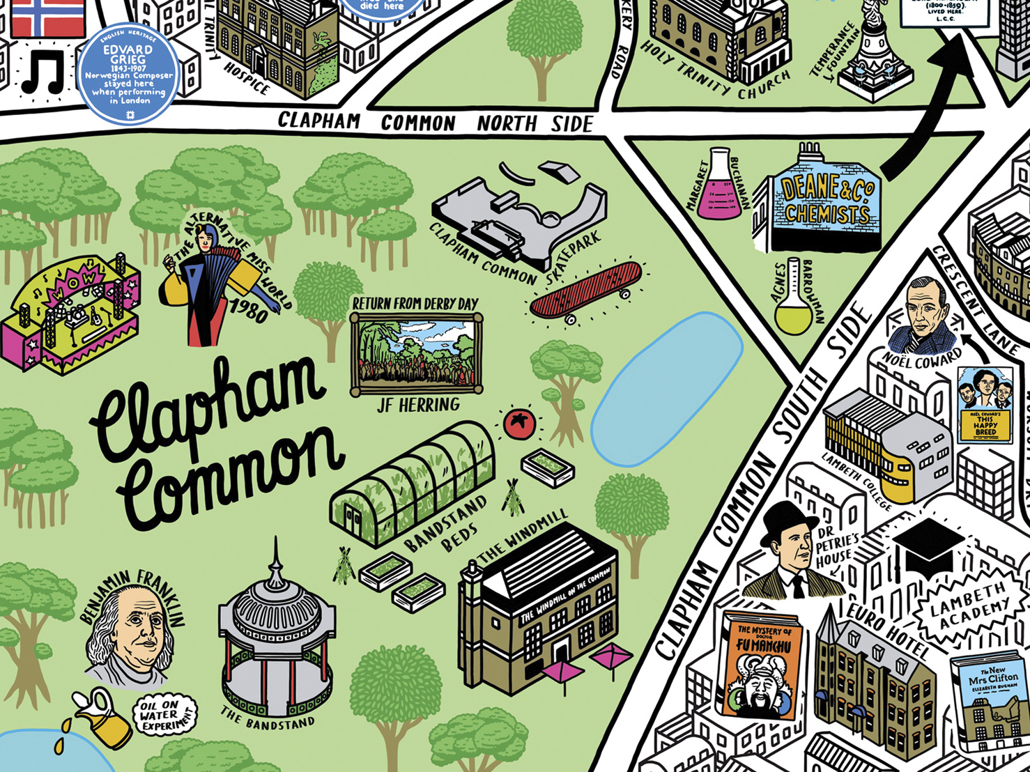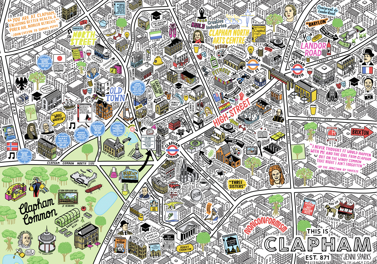 I was asked by this is Clapham to create a map of Clapham that would showcase the area's history and celebrate it's culture. I worked with a local historical society as well as members of the public to research and create the map, which was used as both a public mural and as a paper guide to the area. Updated January 2018.