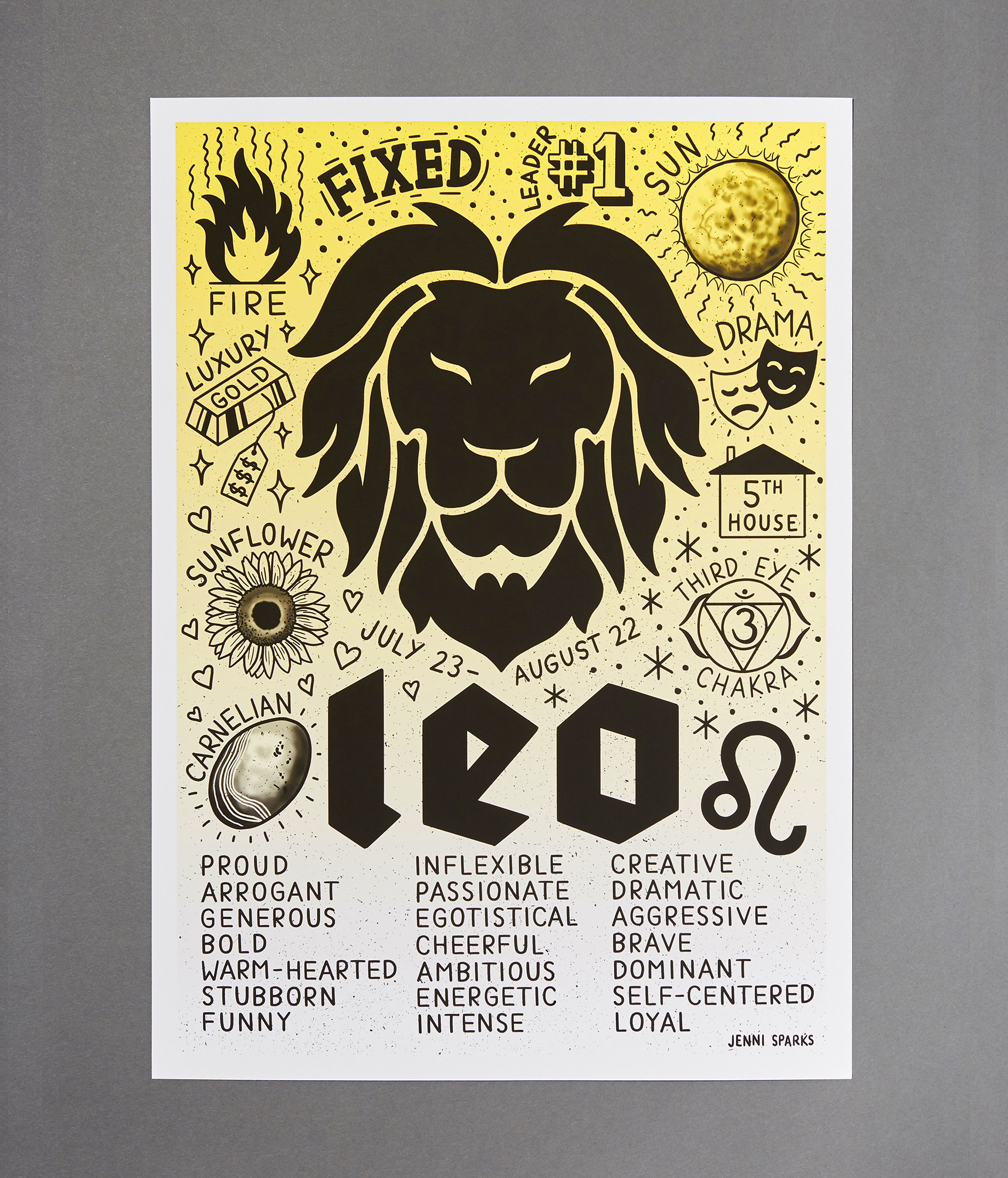An illustrated print all about the starsign Leo. Beautifully giclée printed on Hahnemule Photo Rag.