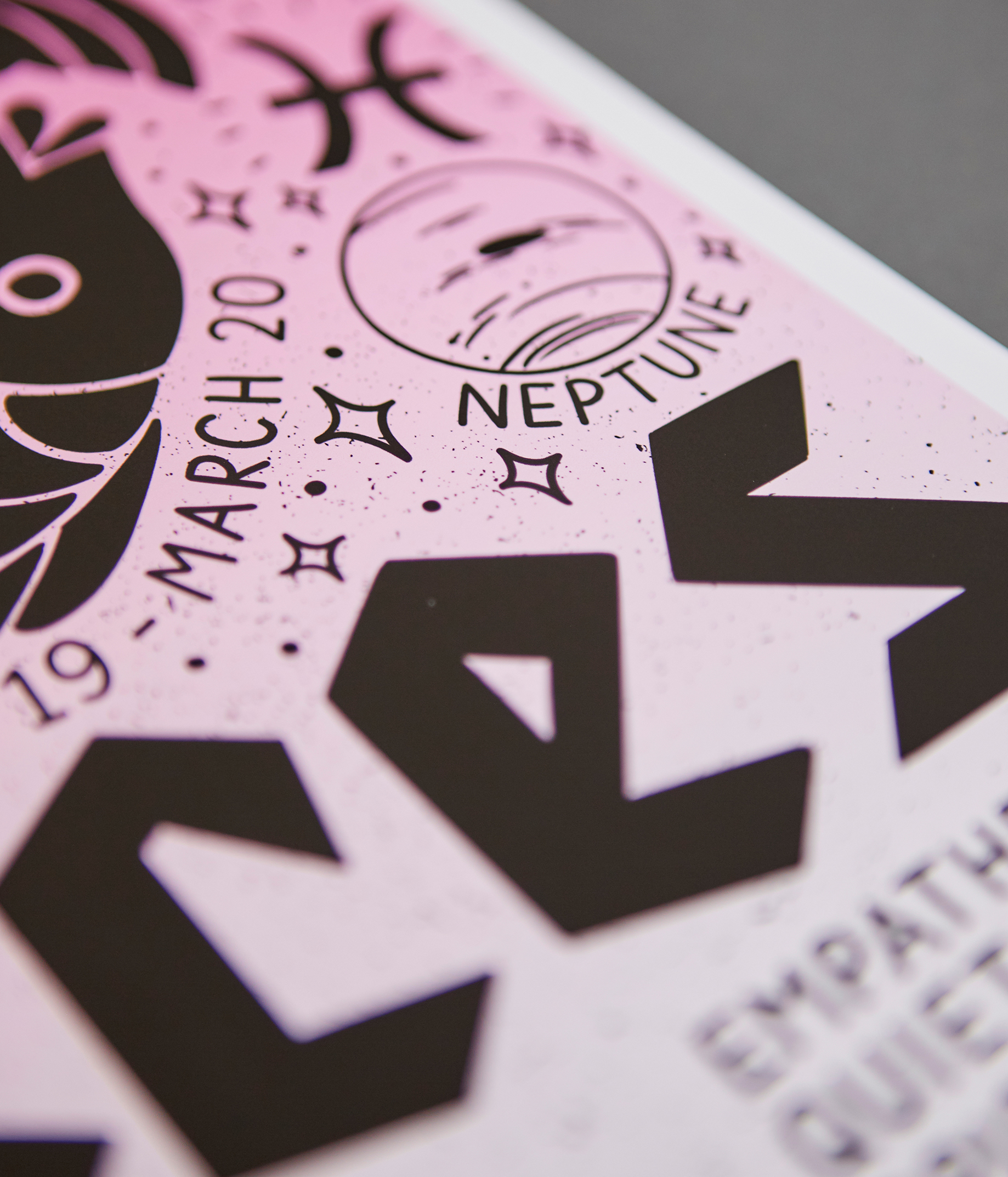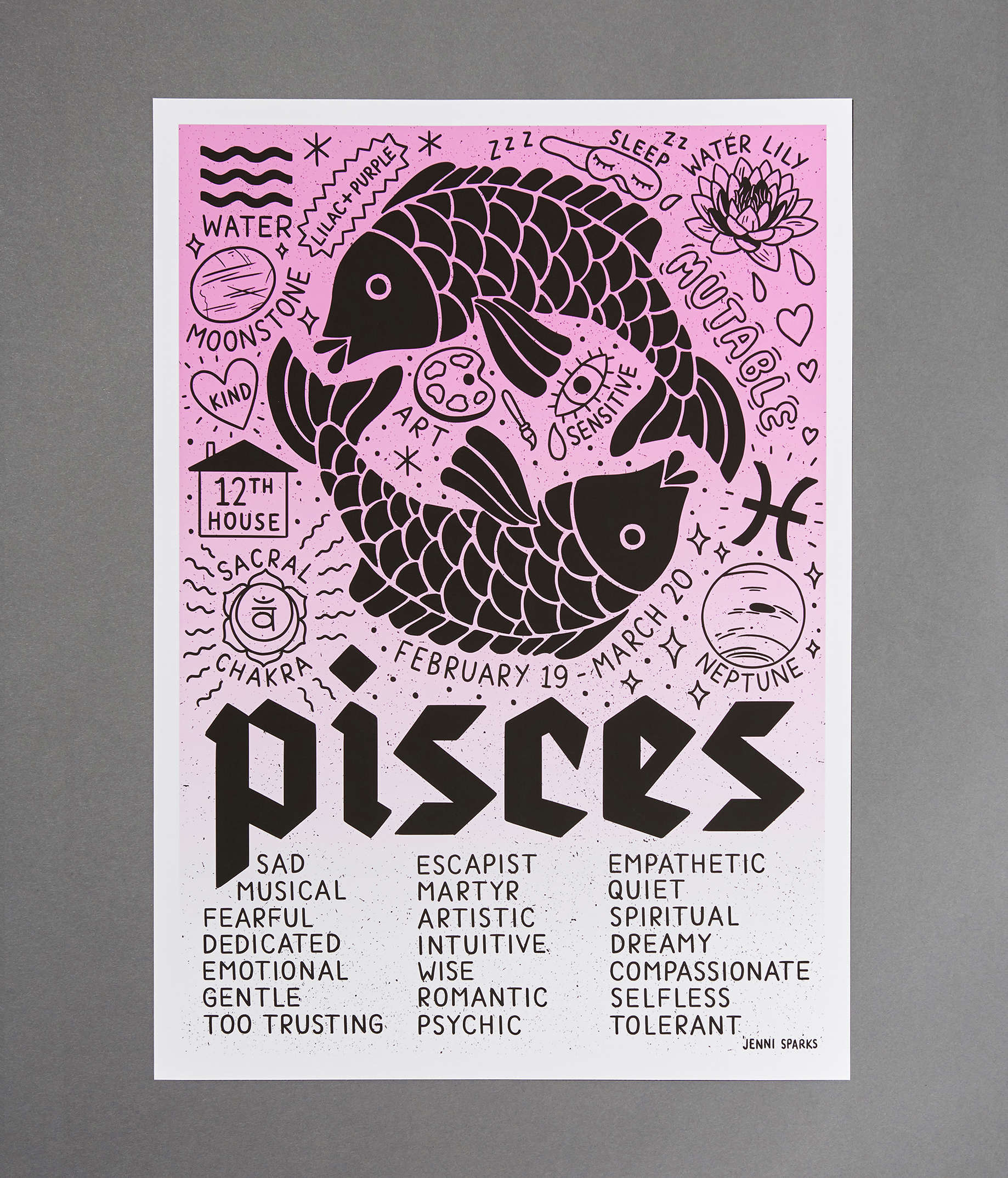 An illustrated print all about the starsign Pisces. Beautifully giclée printed on Hahnemule Photo Rag.
