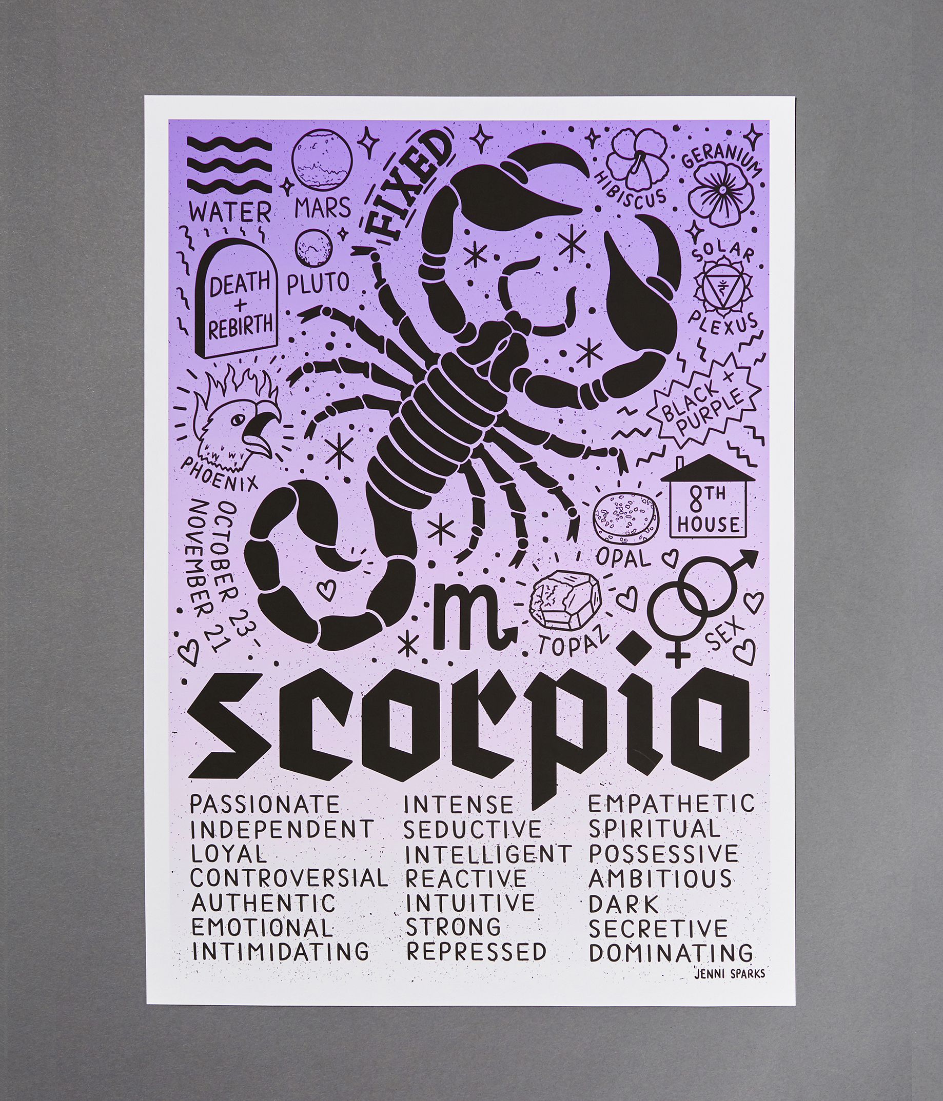 An illustrated print all about the starsign Scorpio. Beautifully giclée printed on Hahnemule Photo Rag.